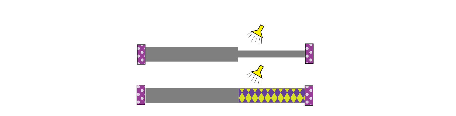 Betragt en stang bestående af to materialer samlet ved \(x = \tfrac{1}{2}\) med