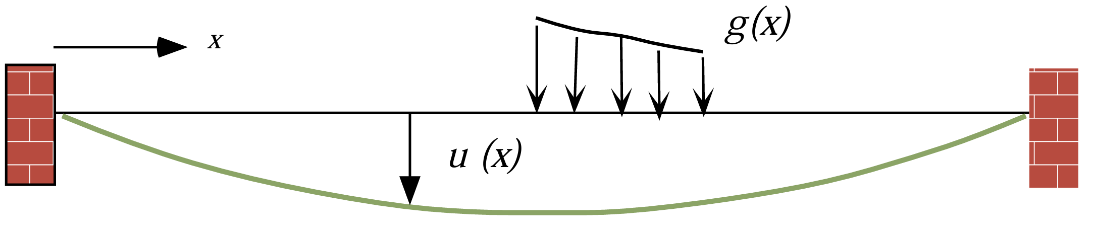 Et lignende eksempel er en tynd elastisk snor, fastgjort i begge ender og udsat for en fordelt belastning \(p(x)\). Her beskriver \(u(x)\) udbøjningen fra hvilestillingen, og \(a(x)\) angiver materialets stivhed. Den matematiske struktur er den samme som for varmeledningsproblemet.