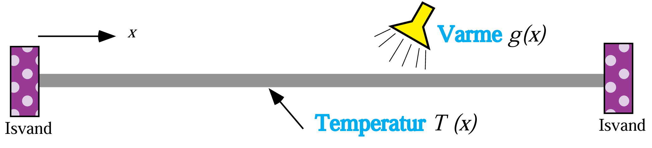 Forestil dig en metalstang af længde 1, hvis to endepunkter holdes på samme temperatur. Langs stangen er der en fordelt varmekilde, f.eks. en elektrisk strøm der varmer materialet op. Vi ønsker at bestemme temperaturfordelingen \(u(x)\) i stangen, hvor \(x \in [0,1]\) angiver positionen. Stangens evne til at lede varme beskrives af en funktion \(a(x)\), kaldet varmeledningsevnen, og den lokale varmekilde beskrives af \(p(x)\). Under stationære betingelser er temperaturfordelingen styret af en differentialligning, der kobler \(u(x)\), \(a(x)\) og \(p(x)\).