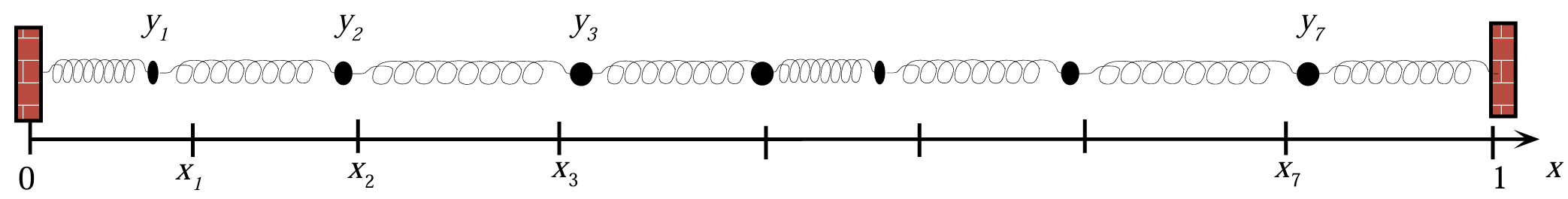 Betragt en kæde af \(N+1\) identiske fjedre med fjederkonstant \(\gamma > 0\), spændt vandret ud mellem to faste vægge. De \(N\) indre knuder \(y_1, \ldots, y_N\) kan forskydes, mens endepunkterne er fastholdte: \(y_0 = y_{N+1} = 0\).