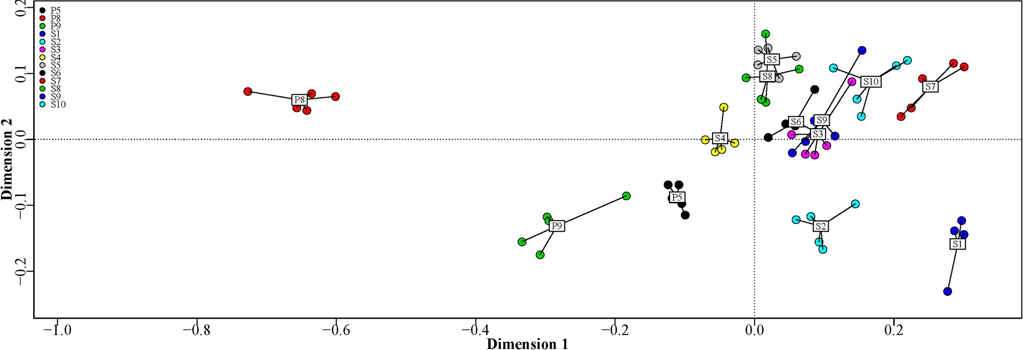 Bemærk, at forfatterne i artiklen anvendte såkaldt non-metric multidimensional scaling (NMDS), som er en generalisering af PCoA, der er velegnet til at håndtere komplekse datasæt og afdække relative relationer i ikke-lineære data. Selvom metoden er anderledes, bør du kunne producere et nogenlunde lignende plot.